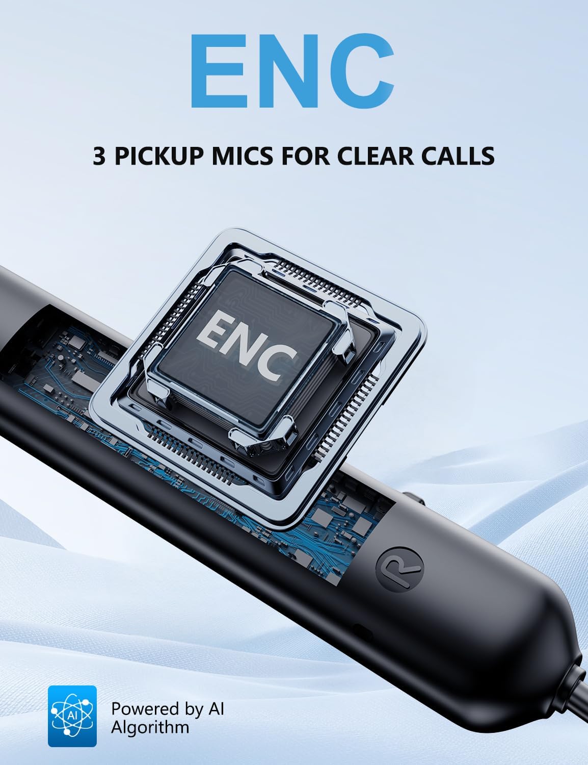 Featuring 3 AI Mics with Environmental Noise Cancellation (ENC) technology, these headphones ensure crystal clear sound quality and exceptional call clarity. The in-ear magnetic neckband design provides a secure and comfortable fit, making them perfect for all-day wear.